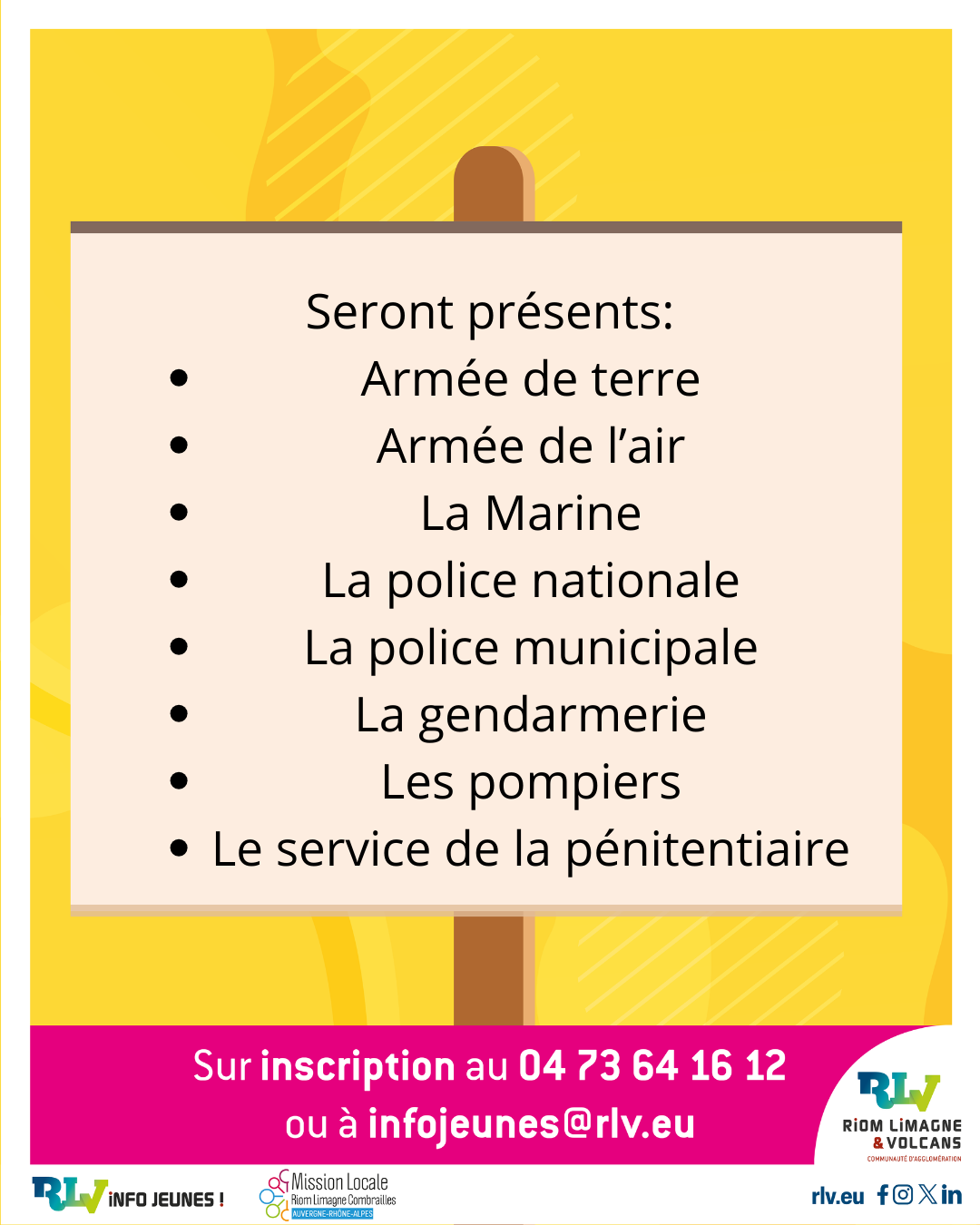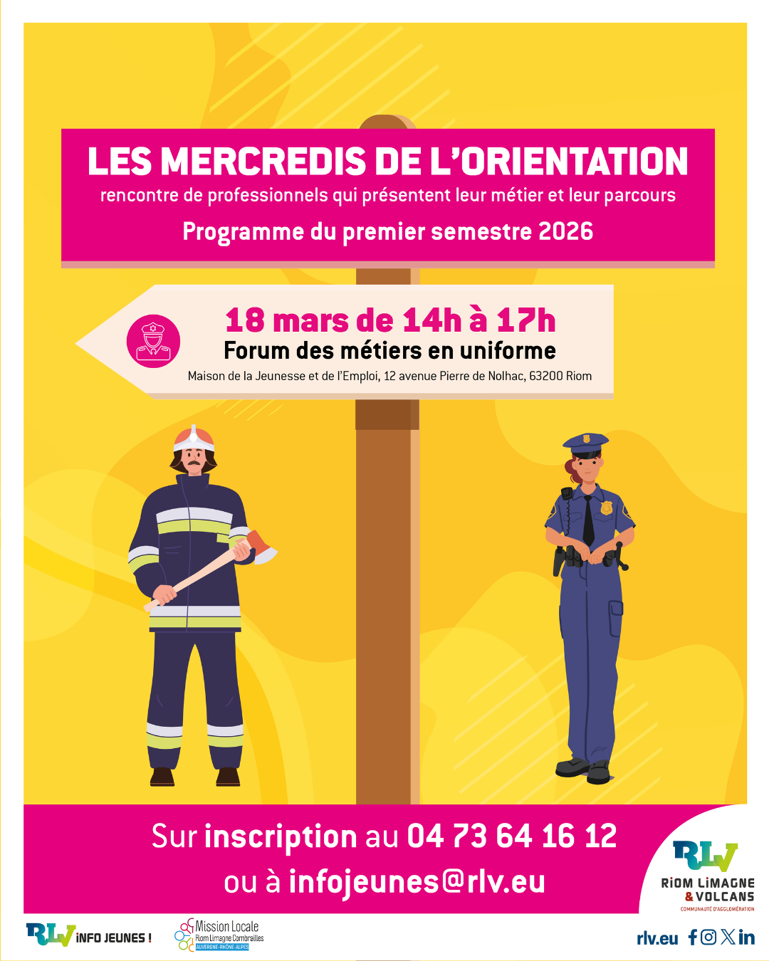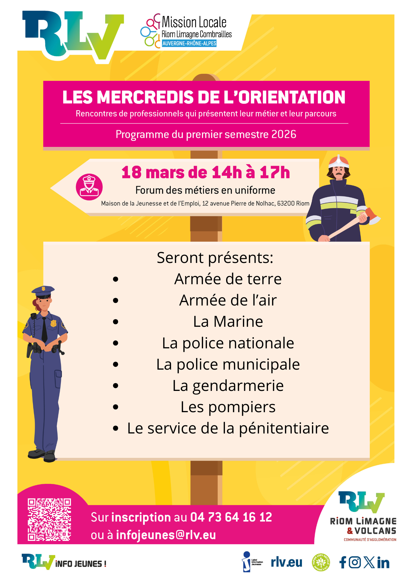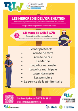 La prochaine date des Mercredis de l’Orientation est le 18 mars de 14h à 17h à la Maison de la jeunesse et de l’emploi à Riom. Les métiers en uniforme sont mis à l’honneur.